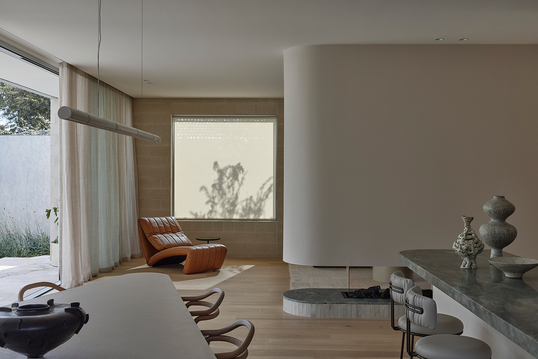 Curved forms – expressed through joinery elements, an archway and the fireplace that subtly separates the meals and living area – perfectly balance the strict orthogonal geometry of the main structure.