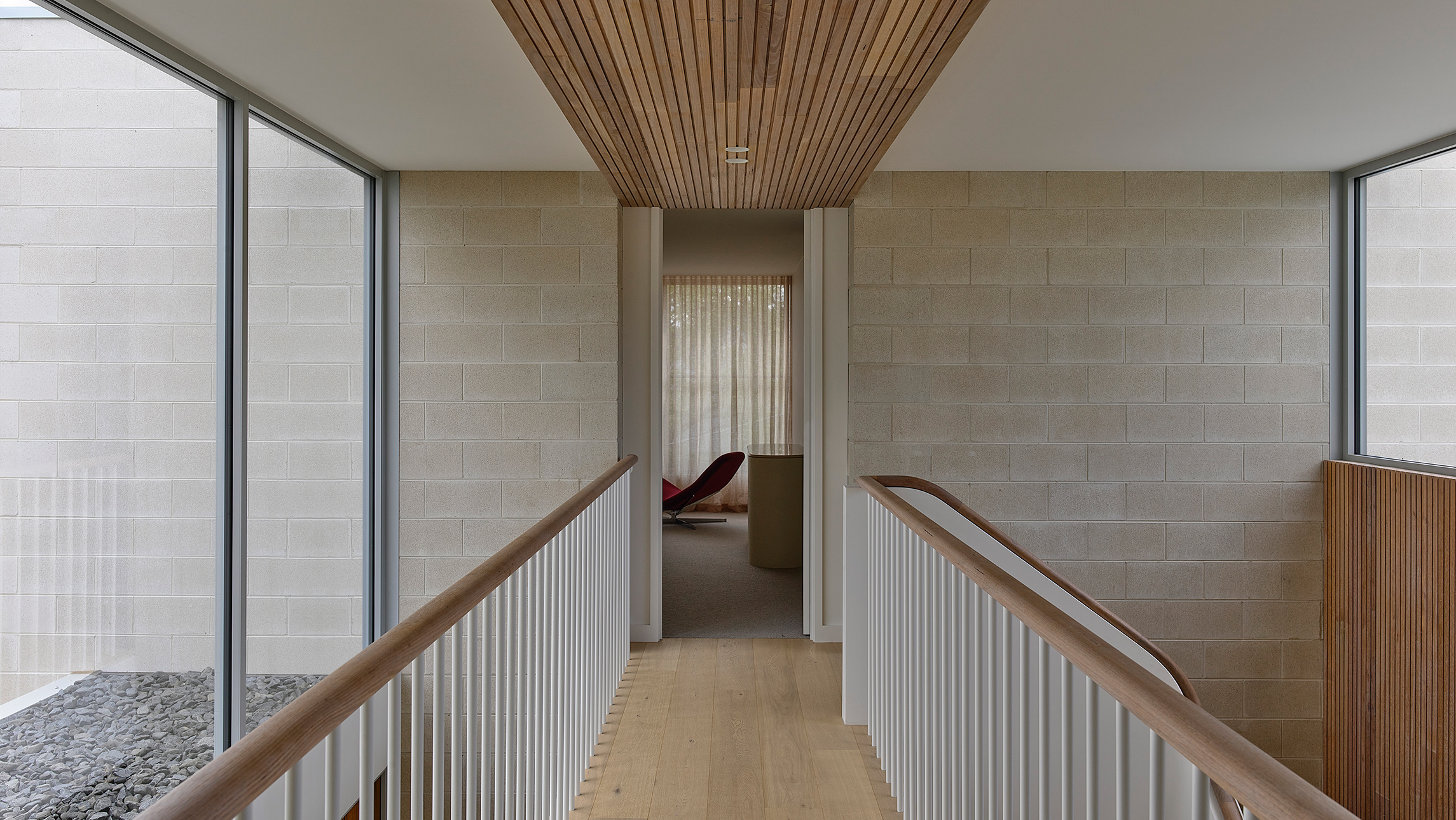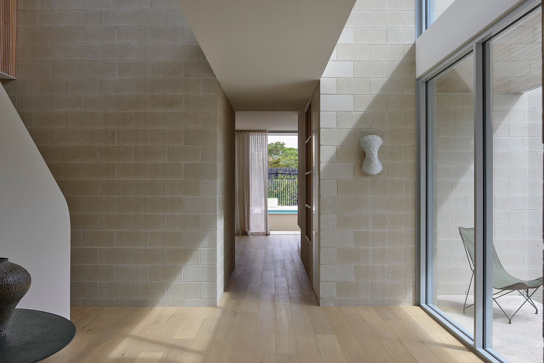 Extensive gazing emits abundant light, enhancing the textural qualities of the large format blocks and timber that feature throughout the interior. The blocks establish the solid and stoic character of the house, which in combination with timber walls, joinery and floors, adds an earthy, calm atmosphere. Curved forms – expressed through joinery elements, an archway and the fireplace that subtly separates the meals and living area – perfectly balance the strict orthogonal geometry of the main structure.