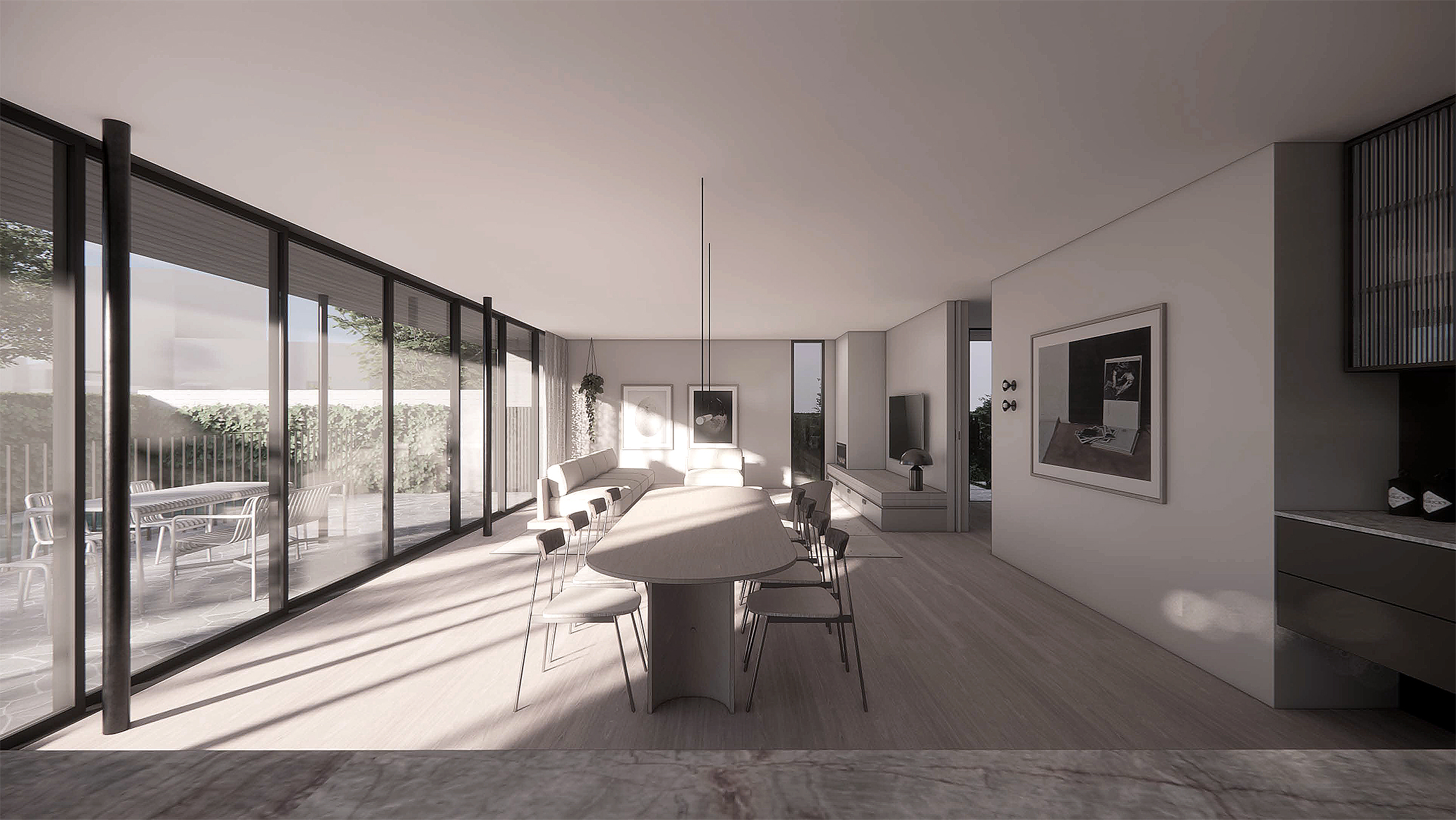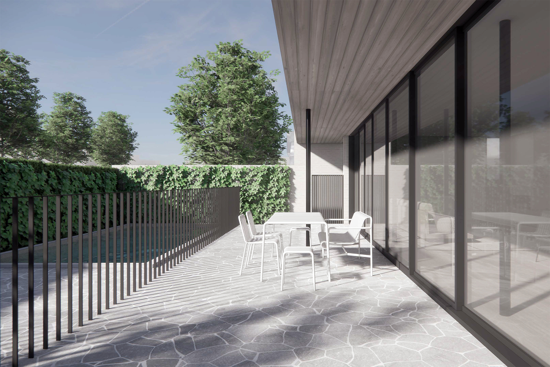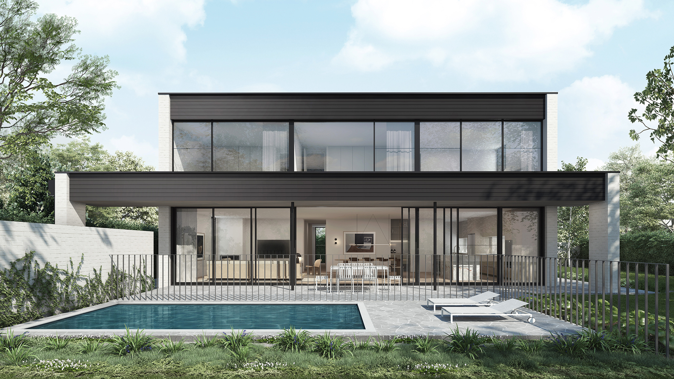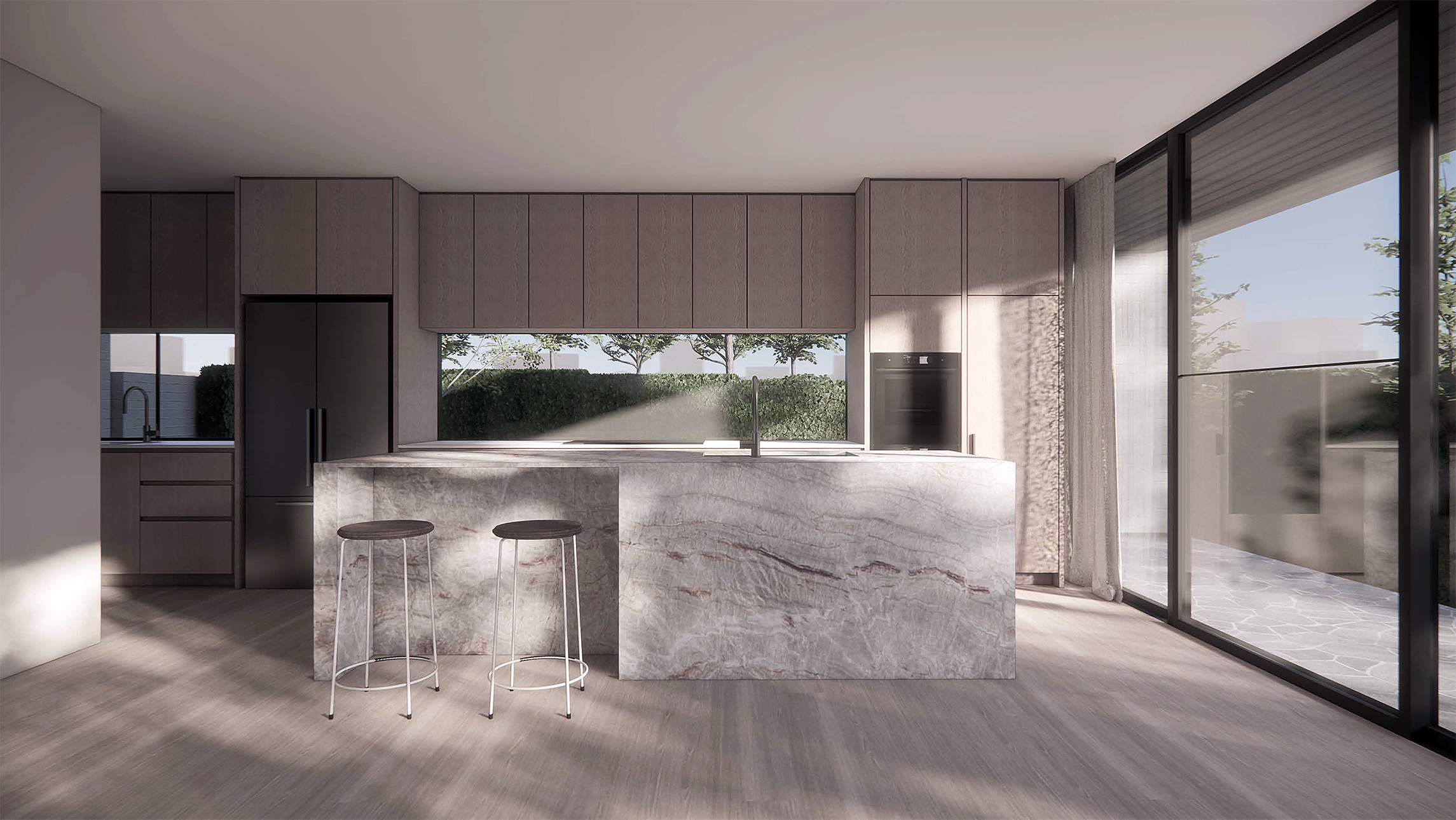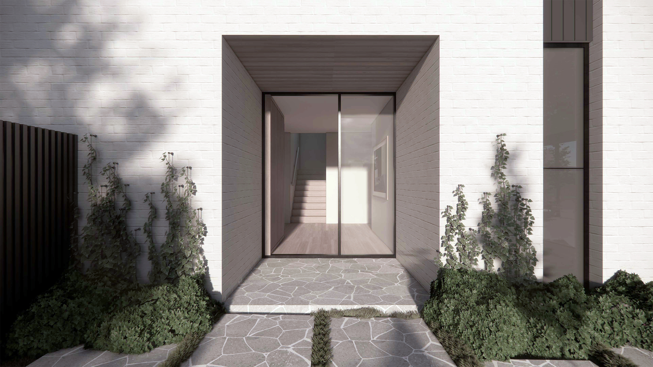 A garden wall leads guests along the path to a discrete side entry, blending the transition between public and private realms. Once inside, the home opens to the northern aspect, celebrating garden vistas and setting the canvas for gathering. Carefully placed western windows frame tailored views while maintaining privacy and moderating the Western sun.
