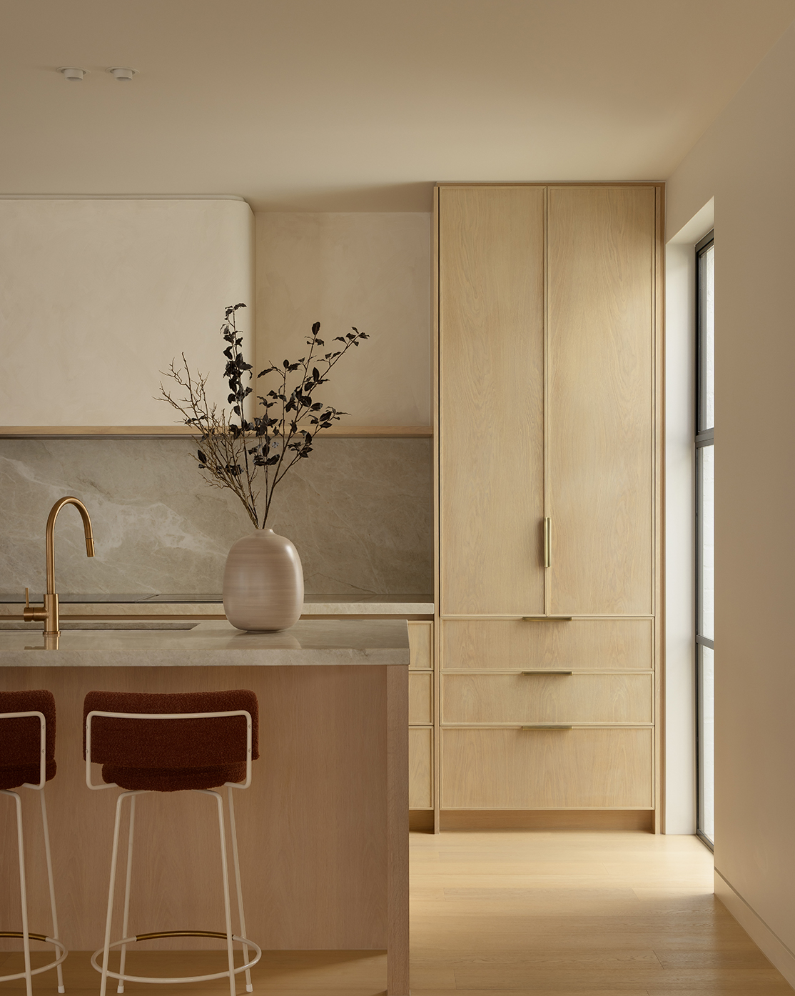 A gabled roof beach house with feature timber ceiling and extensive glass to capture the surrounding native treetops. Pergolas are clad in vines, and a large pool embraces outdoor entertaining.