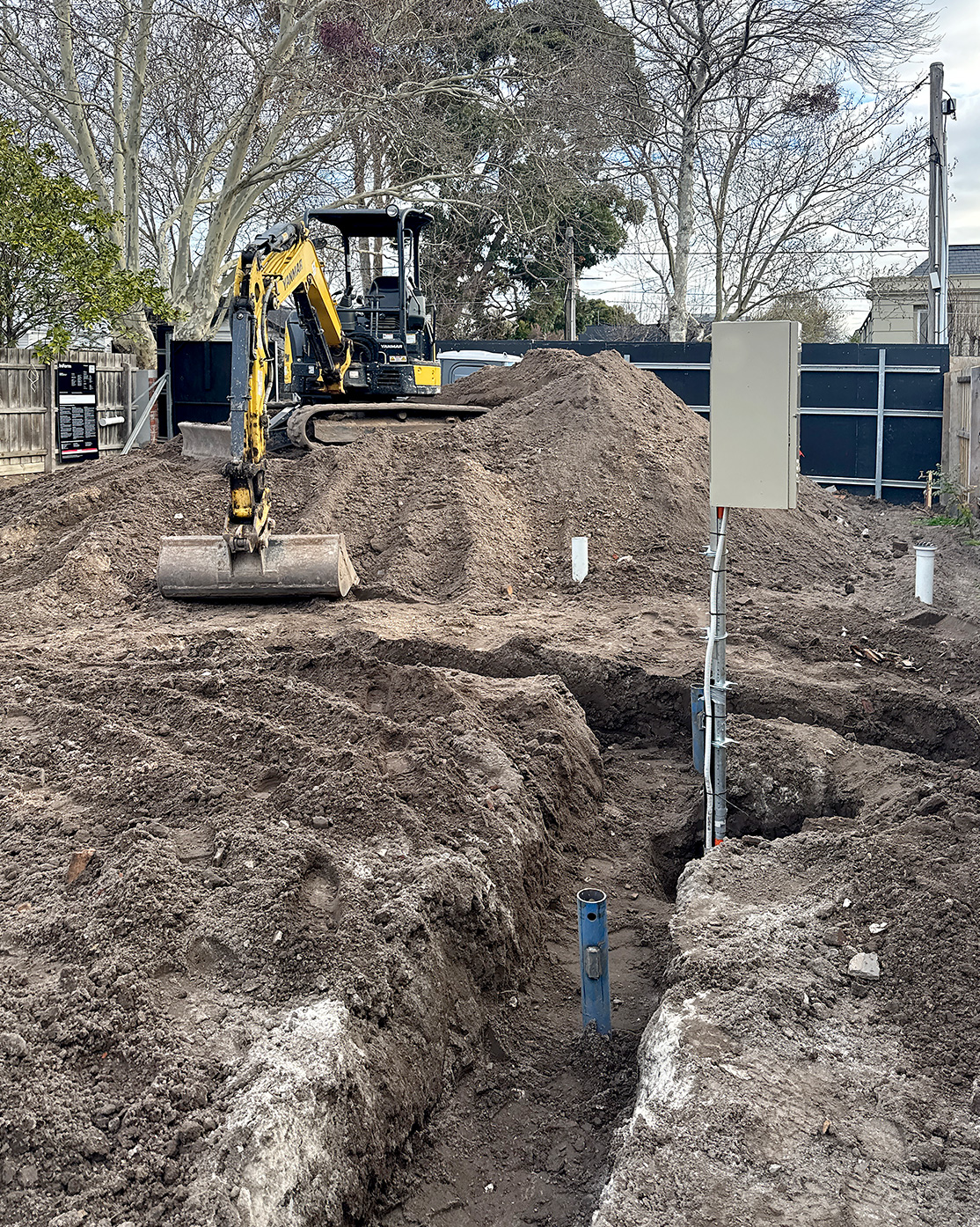 An exciting milestone for our Brighton clients with the approval of a building permit. The construction team have hit the ground running, installing the in-slab drainage and concrete blinding in preparation for pouring the concrete slab.